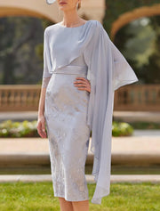 Mother of the Bride Dress Cape Dress Jewel Neck Tea Length Chiffon 3/4 Length Sleeve Wedding Guest Party Dress with Sash / Ribbon Appliques