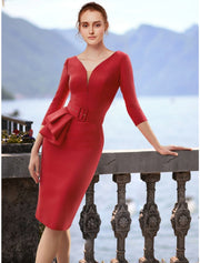 Sheath / Column Cocktail Dresses Elegant Dress Cocktail Party Knee Length Christmas Red Green Dress 3/4 Length Sleeve V Neck Polyester with Ruffles Slit - Red