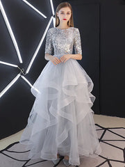 A-Line Bridesmaid Dress Jewel Neck Half Sleeve Sparkle & Shine Floor Length Tulle with Sequin - Show As picture