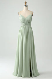 A-Line Chiffon Spaghetti Straps Long Bridesmaid Dress with Slit