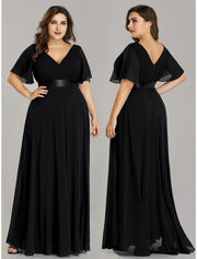 A-Line Empire Fall Wedding Guest Dress For Bridesmaid Plus Size Formal Evening Dress V Neck Short Sleeve Floor Length Chiffon with Pleats Ruched