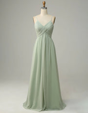A Line Long Spaghetti Straps Sleeveless Dusty Sage Bridesmaid Dress