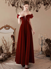 A-Line Off Shoulder Velvet Burgundy Long Prom Dress Bridesmaid Dress Formal Dresses - Burgundy