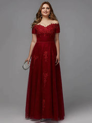 A-Line Plus Size Bridesmaid Dresses Wedding Guest Floor Length Short Sleeve Off Shoulder Lace Lace-up with Beading Appliques