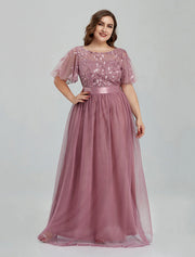 A-Line Prom Dresses Floral Dress Party Wear Quinceanera Floor Length Short Sleeve Jewel Neck Bridesmaid Dress Tulle with Embroidery Splicing - Show As picture