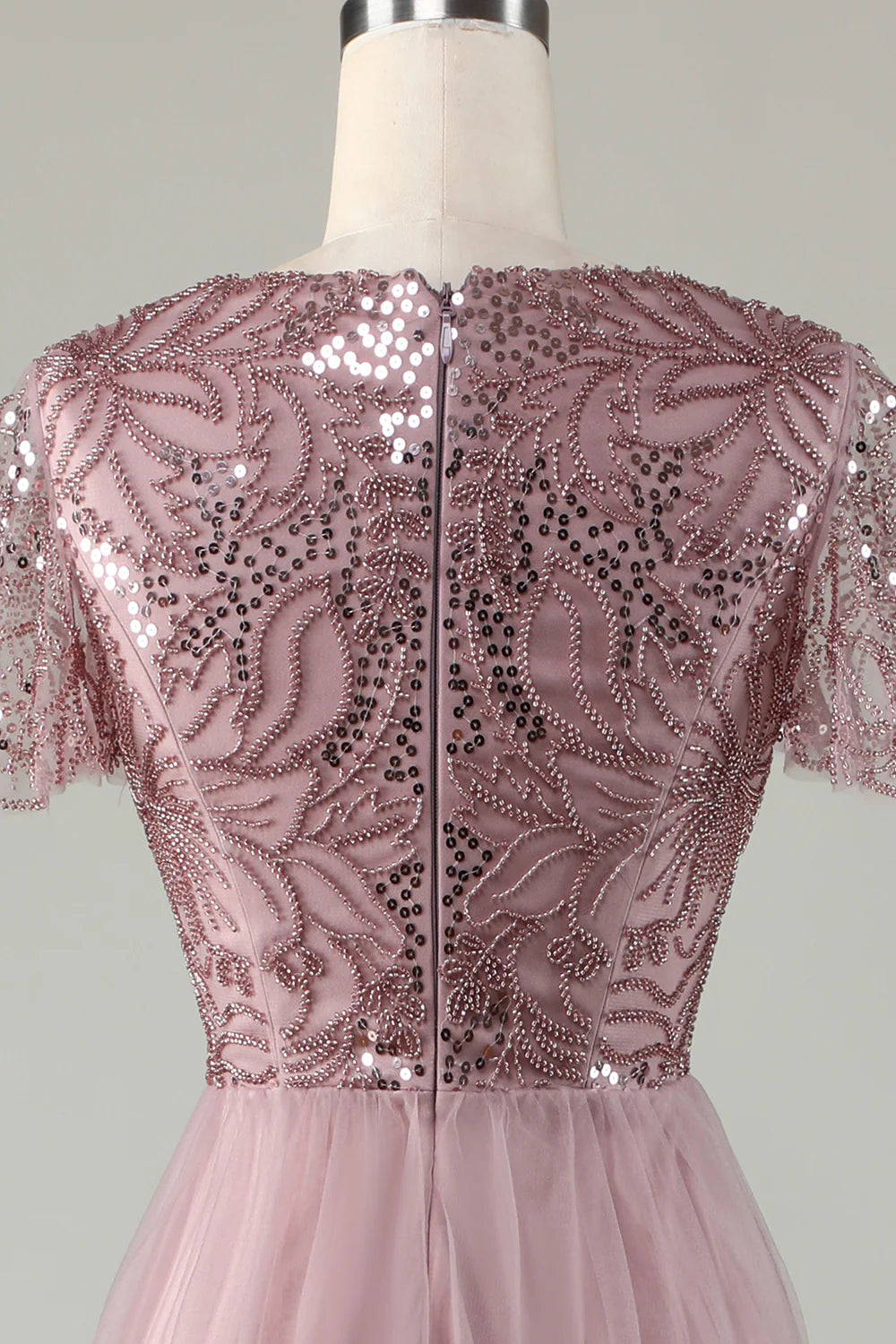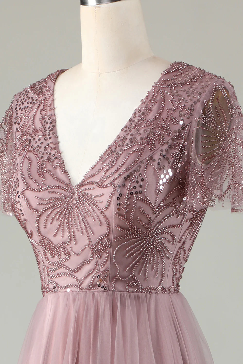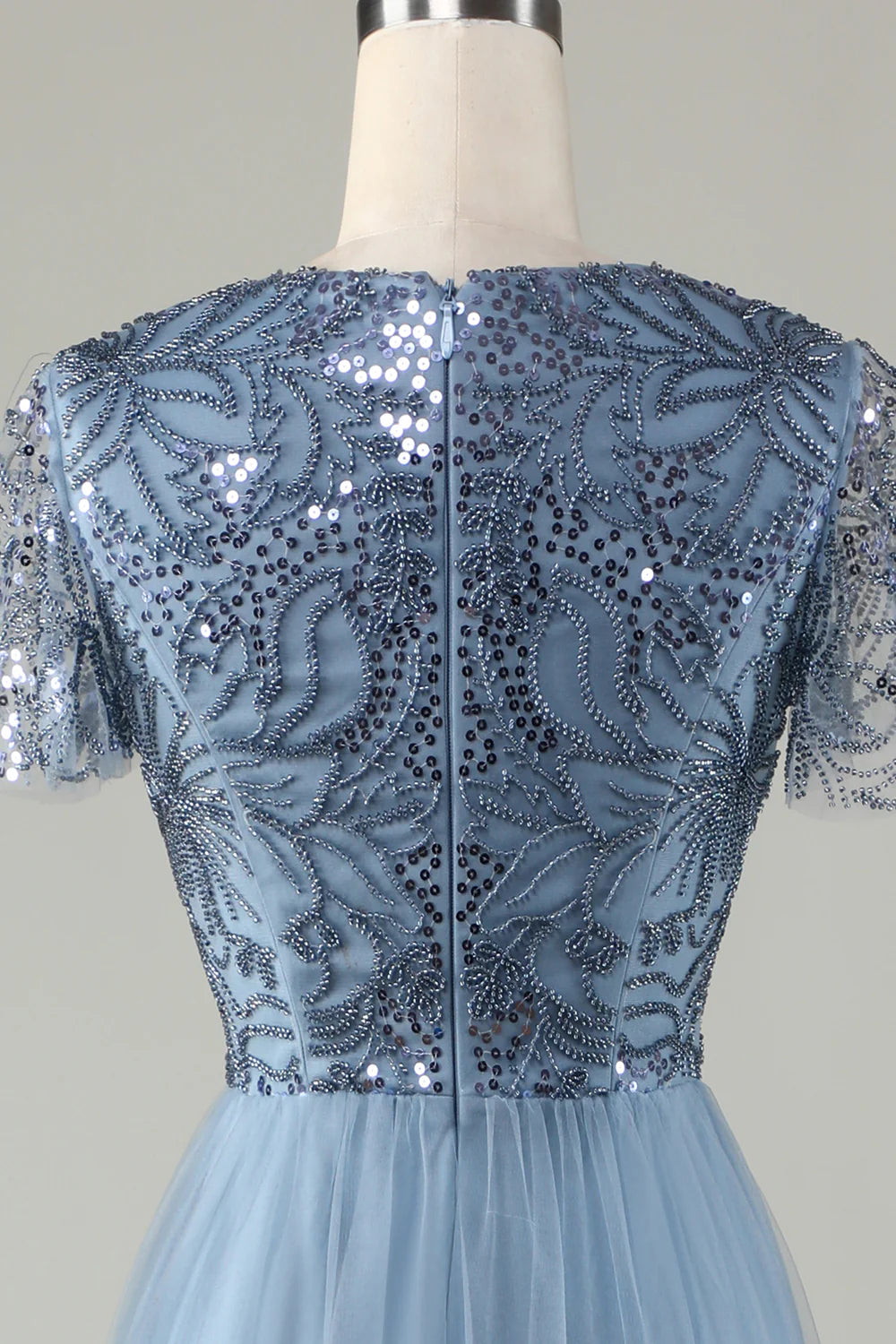 A-Line V Neck Short Sleeve Dusty Blue Bridesmaid Dress with Beading