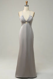 Mermaid Satin Spaghetti Straps Grey Long Bridesmaid Dress - Gray