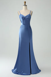 Mermaid Spaghetti Straps Long Satin Bridesmaid Dress with Slit - Grey Blue