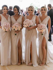 Sheath/Column Ruched Chiffon Sleeveless V-neck Sweep/Brush Train Bridesmaid Dresses
