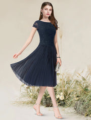 A-Line Cocktail Dresses Flirty Dress Homecoming Wedding Guest Tea Length Short Sleeve Jewel Neck Chiffon with Pleats