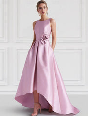 A-Line Cocktail Dresses Formal Wedding Guest Floor Length Sleeveless Boat Neck Pink Dress Satin with Pocket