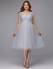 A-Line Elegant Dress Wedding Guest Cocktail Party Tea Length Short Sleeve Off Shoulder Tulle with Sash / Ribbon Criss Cross - Light Grey