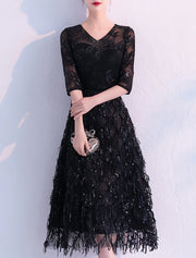 A-Line Flapper Sparkle Party Wear Cocktail Party Dress V Neck Half Sleeve Tea Length Lace with Sequin Tassel - Black