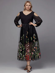 A-Line Plus Size Holiday Cocktail Party Valentine's Day Dress V Neck 3 Length Sleeve Tea Length Tulle with Beading Appliques