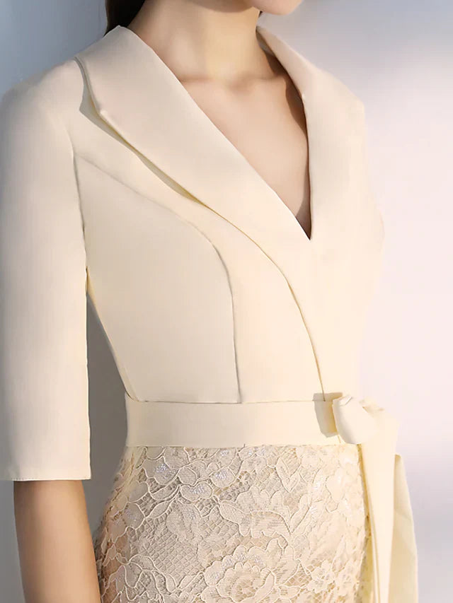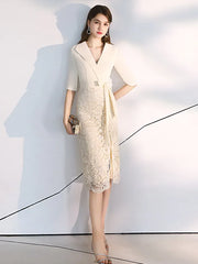 Elegant bodycon Homecoming Cocktail Party Dress V Neck Half Sleeve Knee Length Lace Stretch Fabric with Sash Ribbon - Ivory