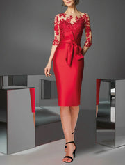 Sheath Homecoming Dresses Cocktail Dresses Luxurious Dress Formal Knee Length 3/4 Length Sleeve Fall Wedding Guest Satin with Lace Pleats Appliques - Red