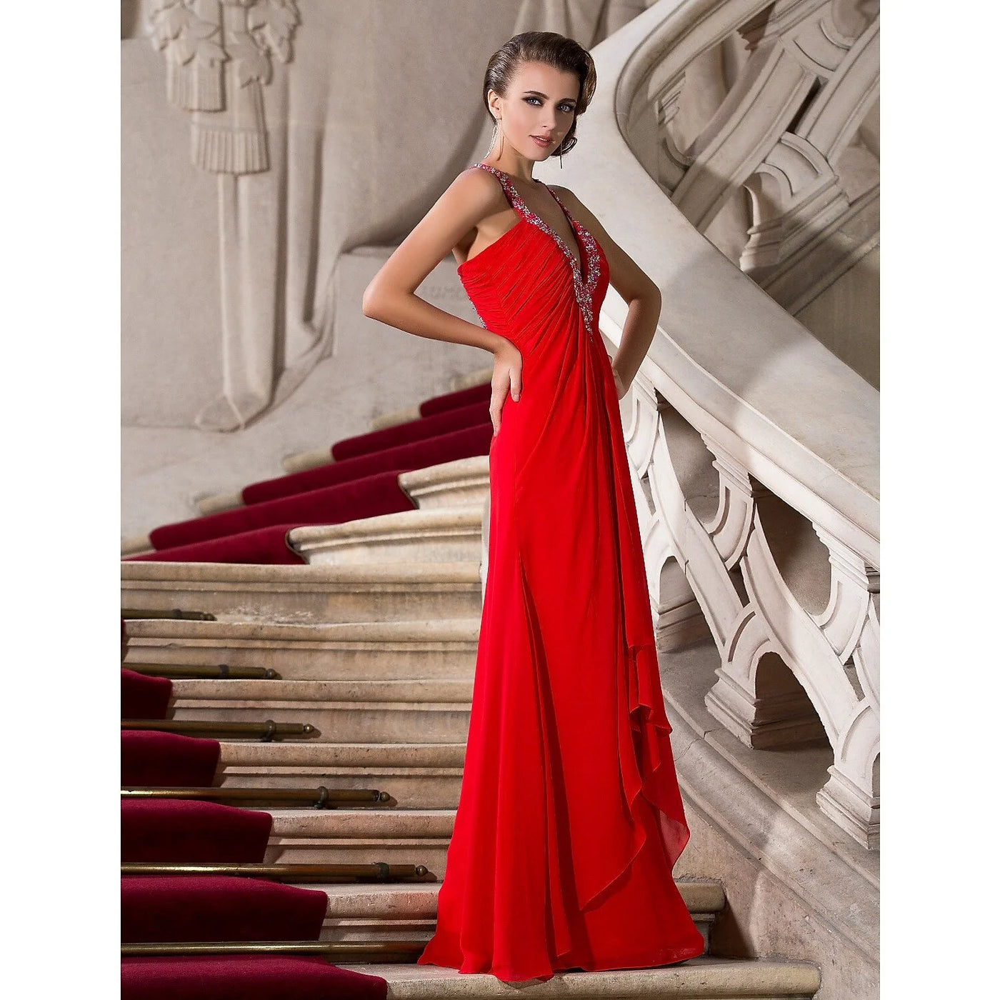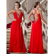 A-Line Celebrity Style Dress Formal Evening Floor Length Sleeveless Plunging Neck Chiffon with Beading - US 2 / UK 6 / EU 32