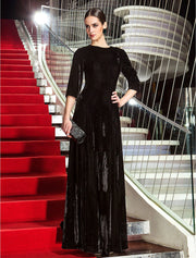 A-Line Celebrity Style Dress Wedding Guest Floor Length 3/4 Length Sleeve Jewel Neck Velvet with Pleats - US 2 / UK 6 / EU 32