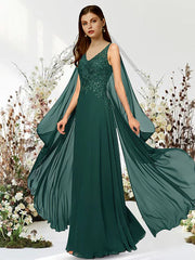 A-Line Empire Elegant Engagement Formal Evening Dress V Neck Sleeveless Floor Length Chiffon with Sequin Appliques