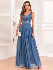 A-Line Evening Gown Elegant Dress Evening Party Prom Floor Length Sleeveless V Neck Belt / Sash Tulle V Back with Glitter Embroidery - US 2 / UK 6 / EU 32
