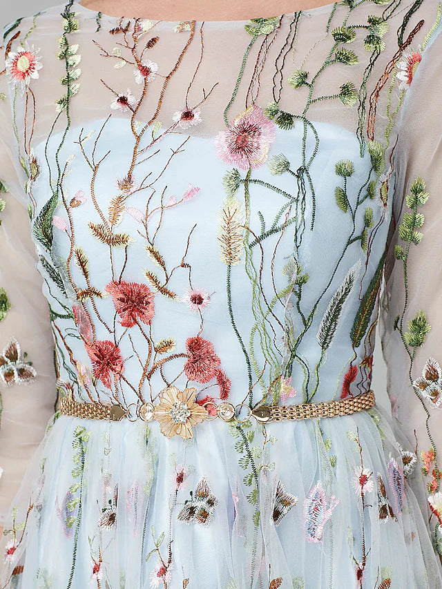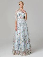 A-Line Evening Gown Elegant Dress Holiday Floor Length 3/4 Length Sleeve Illusion Neck Lace with Embroidery