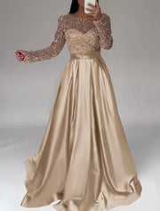 A-Line Evening Gown Elegant Dress Wedding Black Tie Floor Length Long Sleeve Jewel Neck Satin