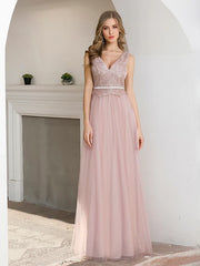 A-Line Evening Gown Elegant Dress Wedding Guest Floor Length Sleeveless V Neck Satin V Back with Sash / Ribbon Sequin