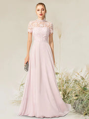 A-Line Evening Gown Empire Dress Engagement Floor Length Short Sleeve High Neck Chiffon with Pleats
