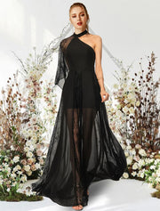 A-Line Evening Gown Empire Dress Wedding Guest Floor Length Half Sleeve One Shoulder Lace with Pleats - US 2 / UK 6 / EU 32
