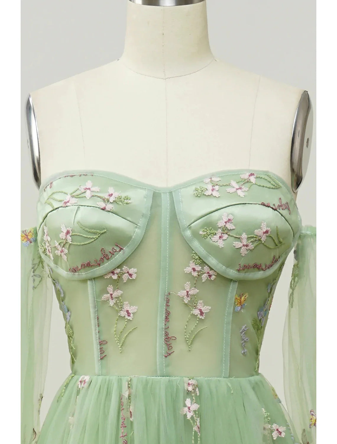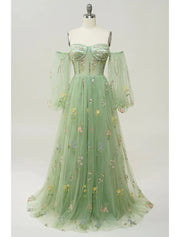 A-Line Evening Gown Floral Dress Formal Floor Length Long Sleeve Sweetheart Lace Backless with Pleats Appliques