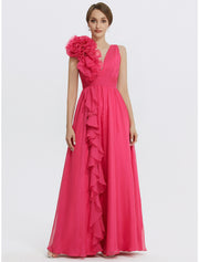 A-Line Evening Gown Floral Dress Formal Wedding Guest Floor Length Sleeveless V Neck Chiffon with Ruched Appliques