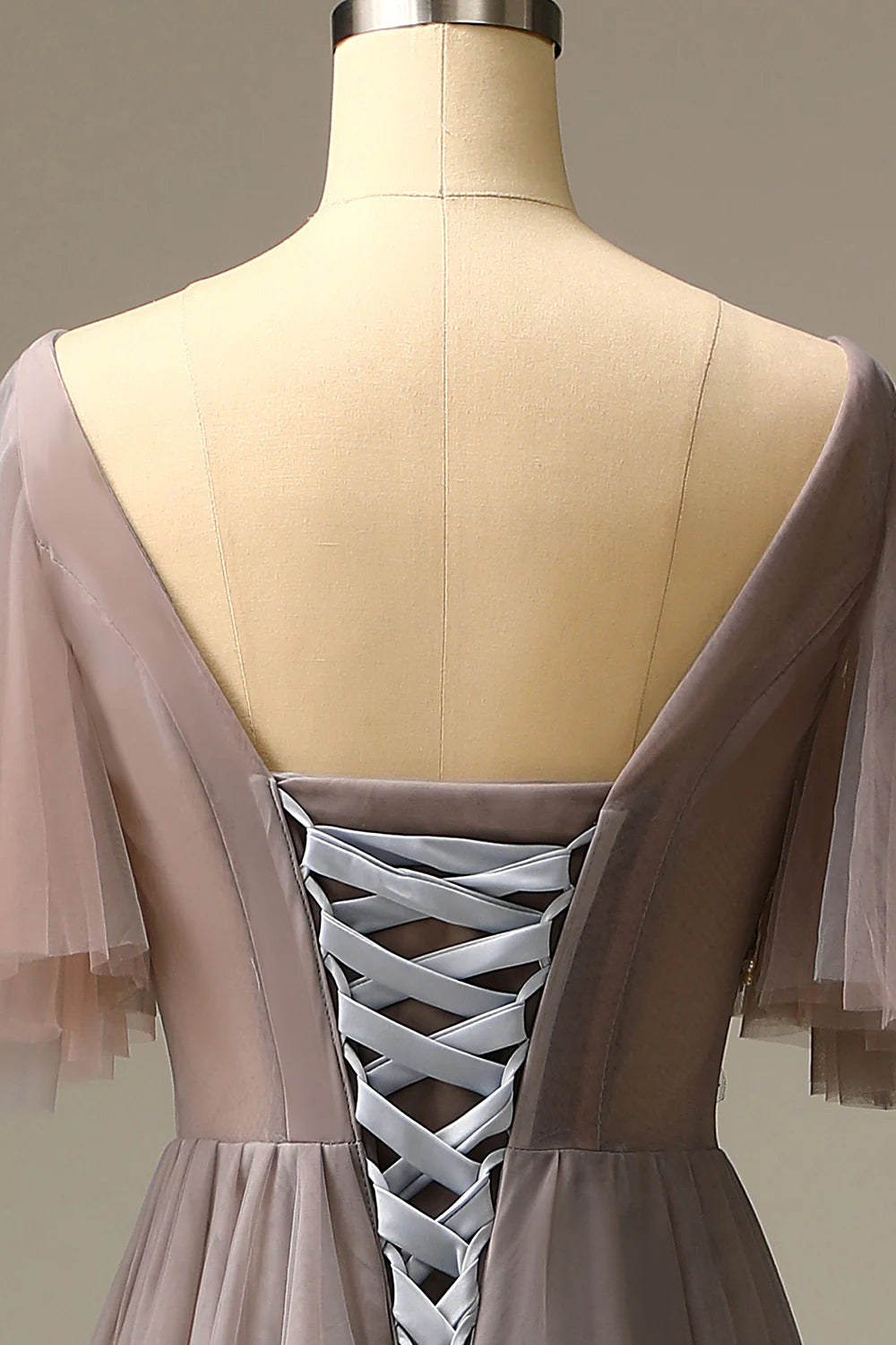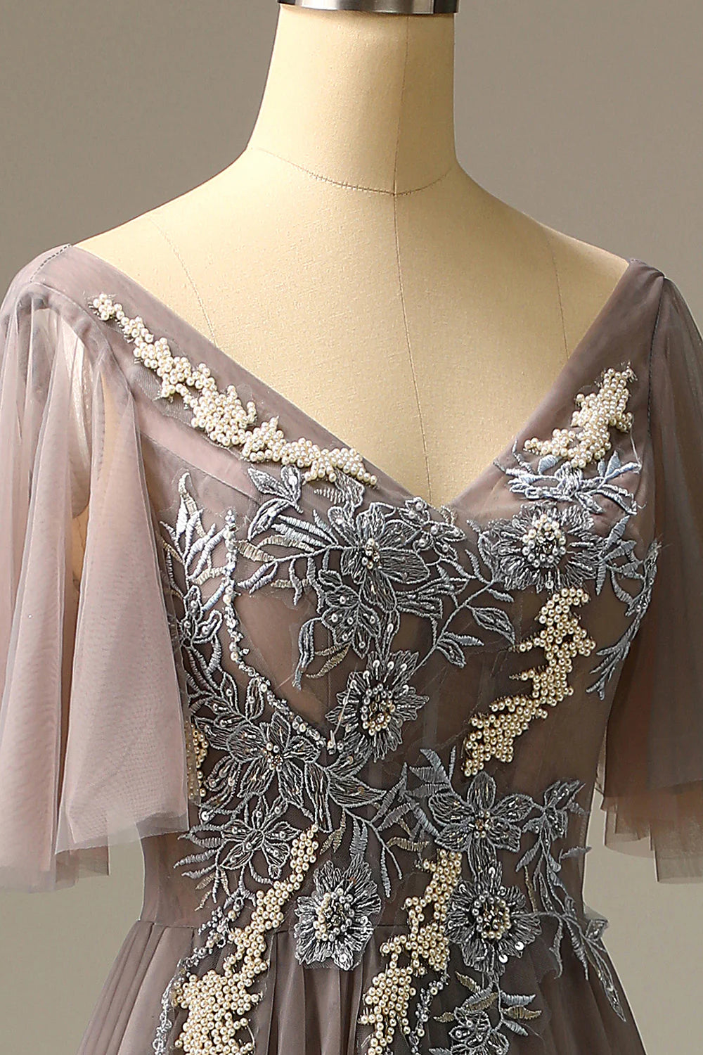 A Line Grey V Neck Short Sleeve Prom Dress With Appliques