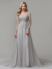 A-Line Luxurious Engagement Formal Evening Dress Illusion Neck V Back Low Back Long Sleeve Chapel Train Chiffon with Sequin Appliques