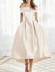 A-Line Mother of the Bride Dress Wedding Guest Elegant Off Shoulder Ankle Length Satin Short Sleeve with Pleats