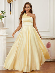 A-Line/Princess Satin Hand-Made Flower One-Shoulder Sleeveless Floor-Length Dresses - US 2 / UK 6 / EU 32