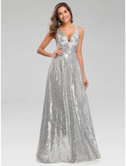 A-Line Prom Dresses Sparkle Dress Wedding Guest Engagement Floor Length Sleeveless V Neck Polyester V Back with Sequin - US 2 / UK 6 / EU 32