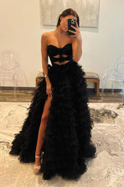 A-Line Strapless Black Tiered Tulle Long Prom Dresses with Flowers