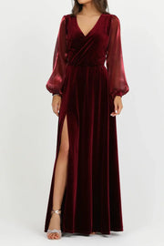 This A-Line dress features a timeless v-neck, long sleeves, perfect for any occasion. Crafted from velvet for a luxurious look and feel. Elevate your wardrobe with this must-have dress. Whether attending prom or any formal event, this dress promises to elevate your style and poise, making you feel not only confident but also beautifully radiant throughout the night. Pair it with your favourite heels and statement jewellery for an unforgettable look!