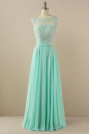 Chiffon Floor Length Beaded Bateau Prom Dress With Appliques - Mint