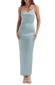 Elegant slim shoulder strap off shoulder satin long backless evening dress Sexy - Light Blue