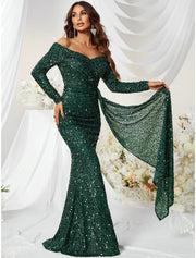 Evening Gown Sparkle & Shine Dress Formal Cocktail Party Sweep / Brush Train Long Sleeve Off Shoulder Polyester with Sequin