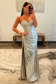Mermaid Beading Strapless Silver Satin Long Prom Dress with Slit