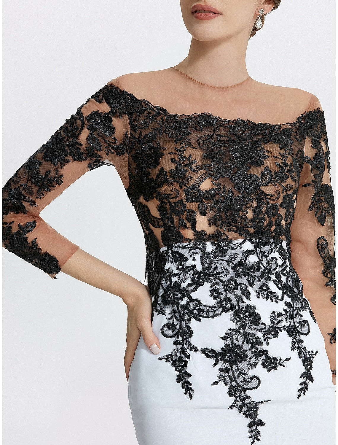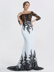 Mermaid Evening Gown Elegant Black Dress Masquerade Black Tie Colorblock Sweep / Brush Train Long Sleeve Jewel Neck Chiffon with Appliques - US 2 / UK 6 / EU 32