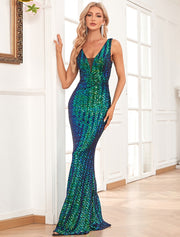 Mermaid / Trumpet Evening Gown Backless Dress Evening Party Prom Floor Length Sleeveless V Neck Sequined Ladder Back with Glitter Sequin