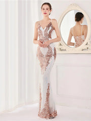 Mermaid / Trumpet Evening Gown Elegant Dress Wedding Guest Floor Length Sleeveless Spaghetti Strap Sequined V Back with Sequin