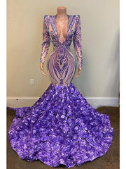 Mermaid / Trumpet Evening Gown Floral Dress Formal Court Train Long Sleeve V Neck African American Sequined with Sequin Beautiful With Flowers - US 2 / UK 6 / EU 32