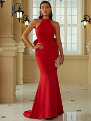 Mermaid / Trumpet Evening Gown Maxi Dress Formal Court Train Sleeveless Halter Polyester with Ruffles - US 2 / UK 6 / EU 32