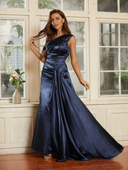 Sheath/Column Elastic Woven Satin Ruffles One-Shoulder Sleeveless Sweep/Brush Train Dresses - US 2 / UK 6 / EU 32