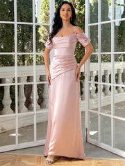 Sheath / Column Evening Gown Sexy Dress Wedding Party Sweep / Brush Train Short Sleeve Spaghetti Strap Satin with Ruched Pearls Sequin