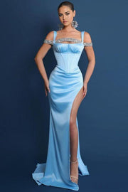 Sheath Mermaid Off the Shoulder Sweep/Brush Train Satin Prom Dresses Party Dress With Ruched Slit